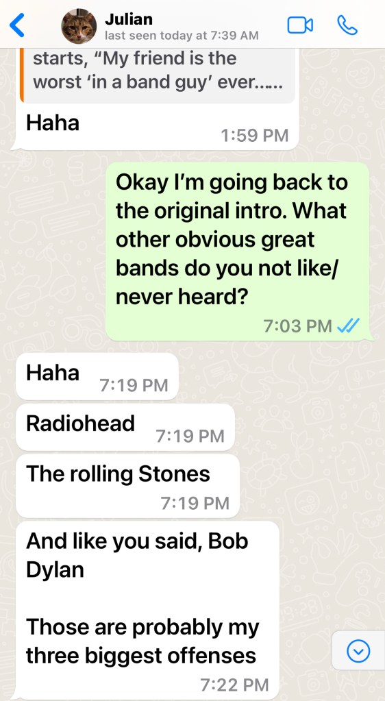 That’s my friend for Julian for ya. Yea I know what you’re saying, “I got a friend who doesn’t like oysters…We agree to disagree….blah, blah, blah” But Julian also doesn’t like Bob Dylan or The Rolling Stones and he’s in band! WHAT THE FUCK? Good fella…. fine musician… that Julian but after typing all this out – I wonder if we should we still be friends. The only solution? Sporadically drive by his house and dump trash on his yard like Tom Cruise in All The Right Moves.
